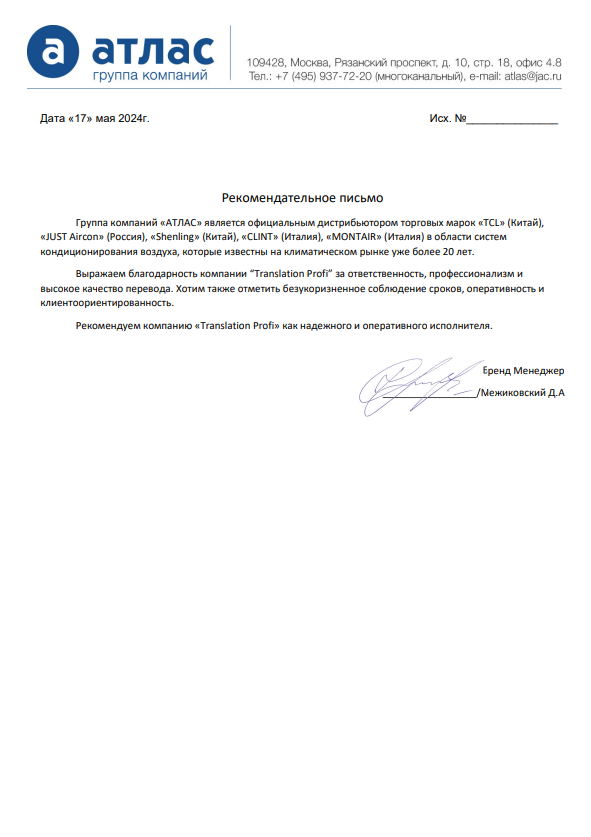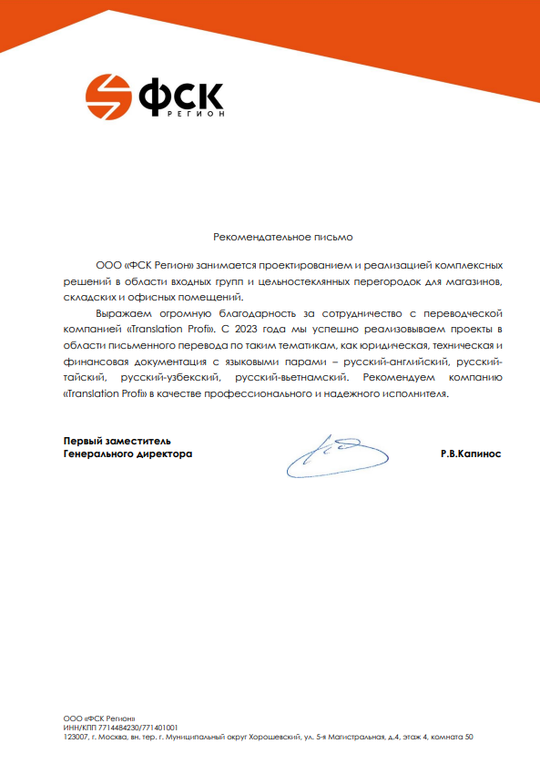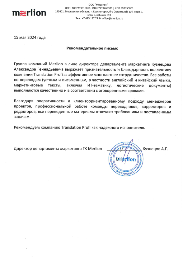 От лица компании ООО «ТрансКомСервис» выражаю благодарность лингвистическому бюро «Транслейшн Профи» за плодотворное сотрудничество и оперативную работу по переводу руководств для иностранного оборудования. Среди разных терминов и аббревиатур специфической отрасли специалисты Транслейшн Профи смогли точно определить и передать смысл. Рассчитываем на то, что наши компании впредь останутся в числе надежных партнеров…