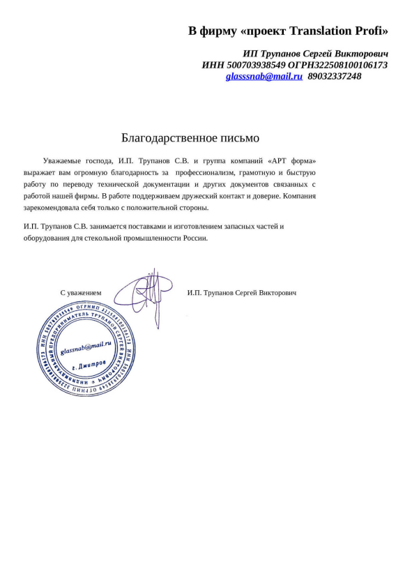 Рекомендую специалистов «Translation Profi», как настоящих экспертов в области технической информации и обладателей узкопрофильных знаний большого количества тематик. Не раз обращался с серией специализированных переводов и каждый раз результат был на высоте. Перевод сделан грамотно, со знанием специфики и специальной терминологии, что говорит о высокой квалификации переводчика и редактора…